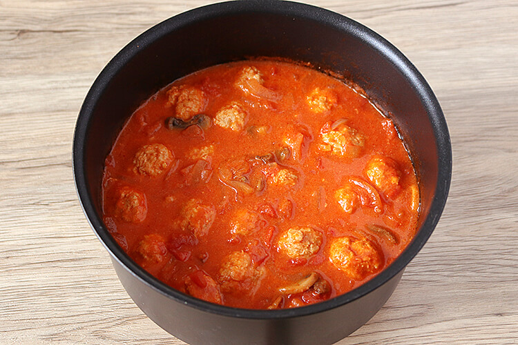 1)「野菜入り鶏団子のトマトミルク煮」の水分が多い場合は軽く煮つめ、鶏団子は崩しておく。