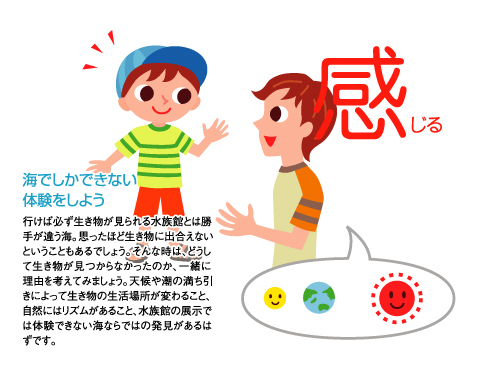 天候や潮の満ち引きによって、生き物の生活場所が変わること、自然には自然のリズムがあることなど、水族館の展示では体験できない、海ならではの発見があるはずです。