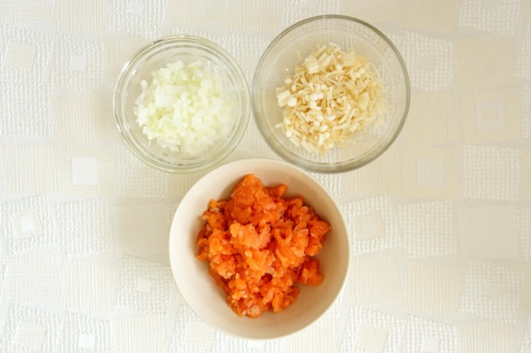 鮭は身を包丁で粗目にたたく。玉ねぎはみじん切りする。えのきは石づきを取り、包丁で長さ1㎝ほどに切る。 - 2.