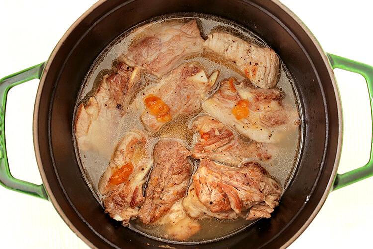 鍋にオリーブ油を入れ中火で熱し、スペアリブを入れ全体に焼き色がつくまで焼く。